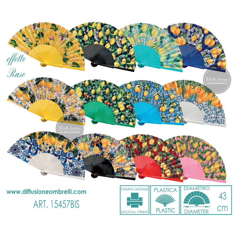 Ventaglio in plastica e tessuto effetto raso, fantasia limoni, 24 bacchette in tinta. Assortito in 12 fantasie come in foto. Diametro 43 cm. La vendita di ventagli all'ingrosso è riservata a rivenditori del settore.
