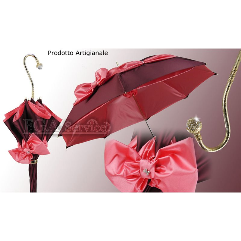 Ombrello Donna 61/8 Manuale, doppio tessuto, Asta dorata, bacchette in acciaio, Esterno bordeaux, interno rosa, Impugnatura in ottone dorato con cristallo Swarovski. La distribuzione e vendita all'ingrosso, in Italia e in Europa, è riservata a rivenditor