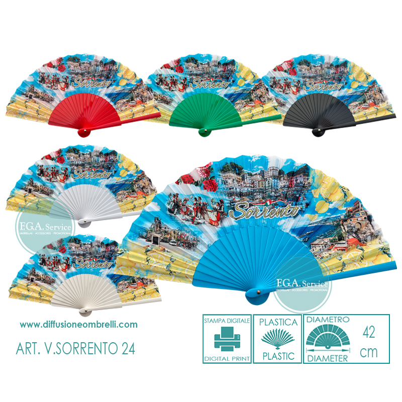 Ventaglio Sorrento Souvenir con immagini della città e limoni della costiera sorrentina. Nuovo modello 24 stecche in plastica rubusta colorate.